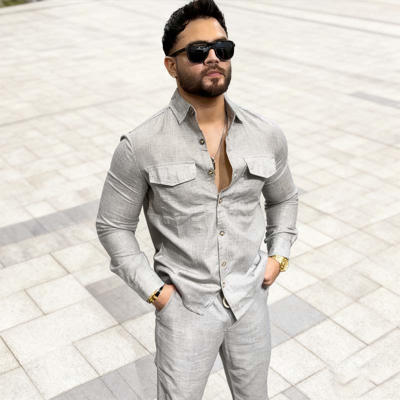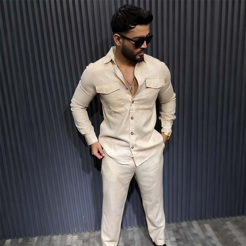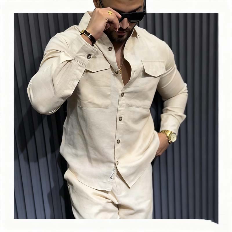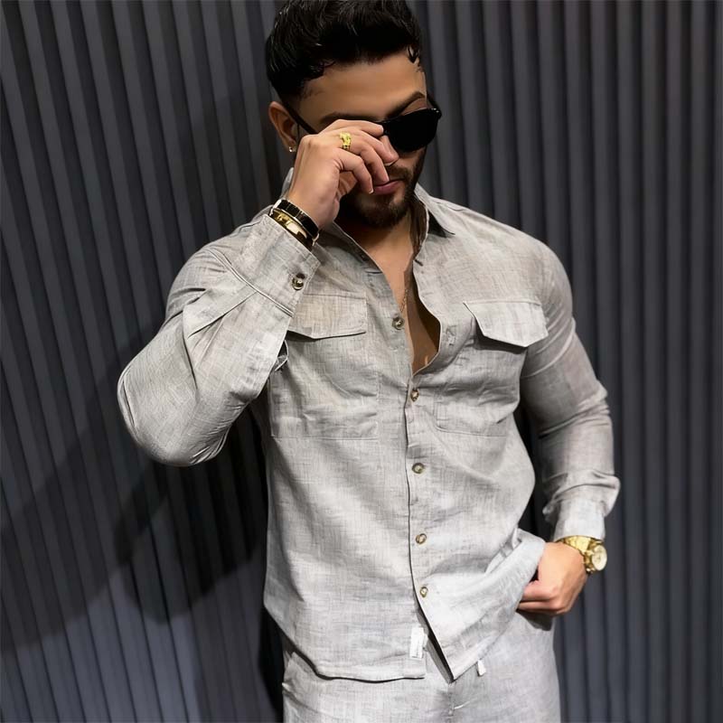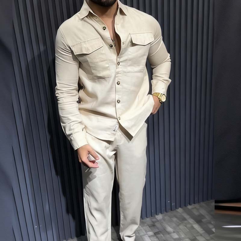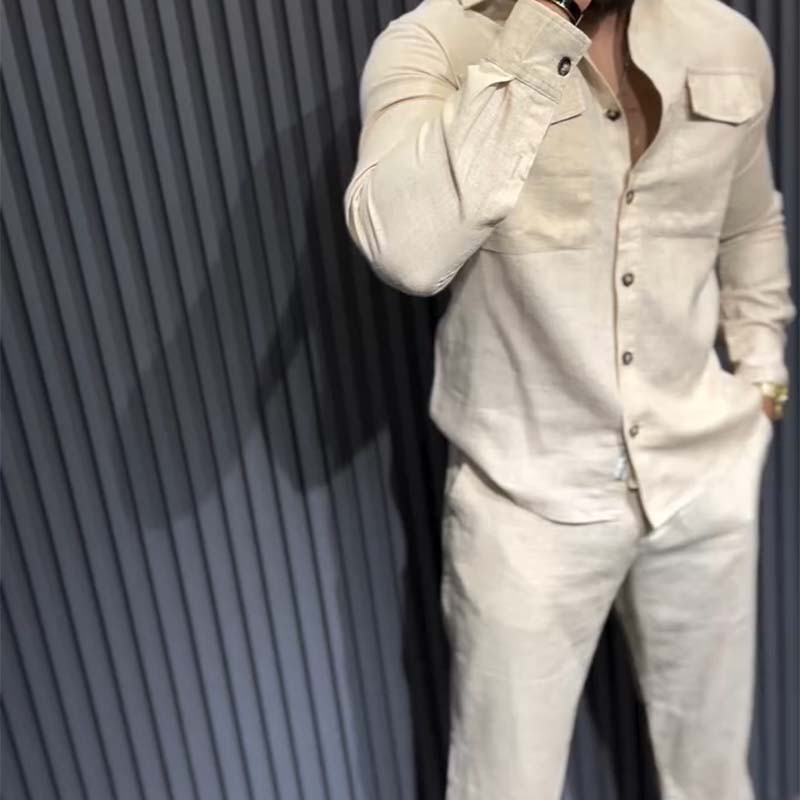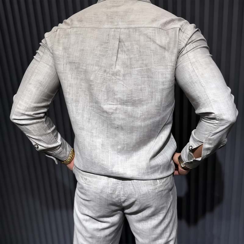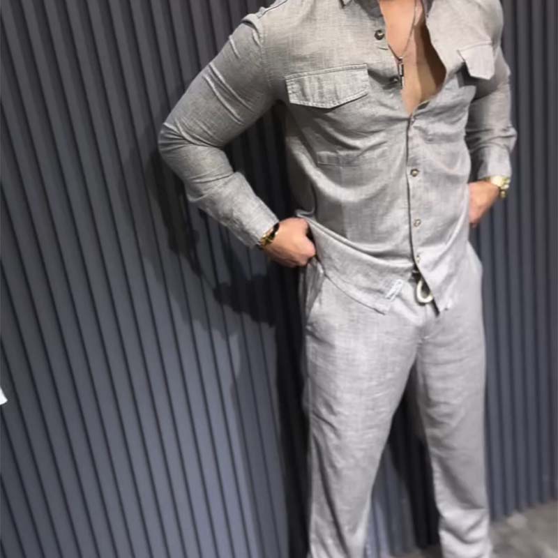 Herrskjorta med långa ärmar, reverskrage, ficka och högkvalitativa byxor i en kostym av bomulls- och linneblandning.