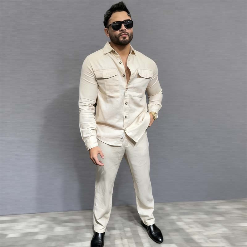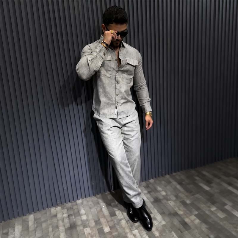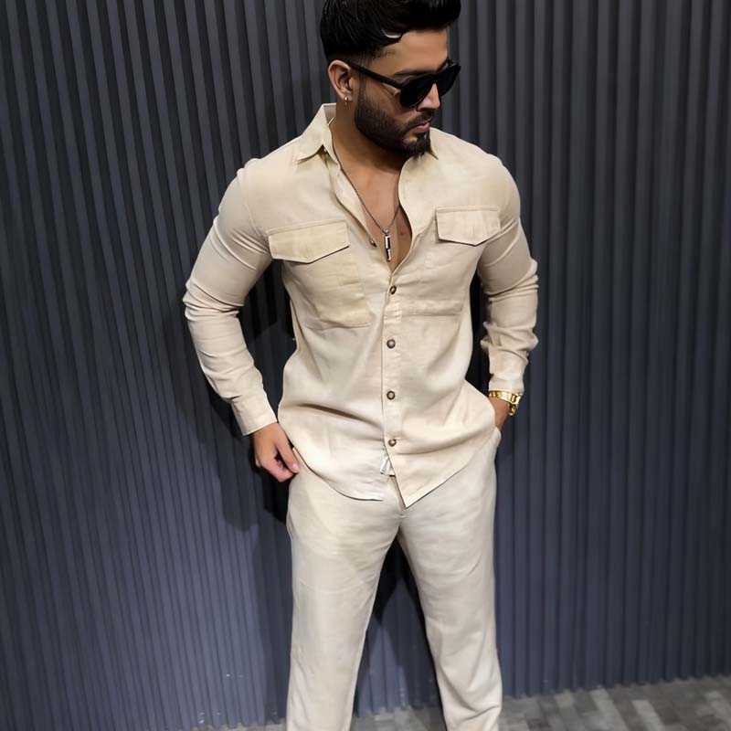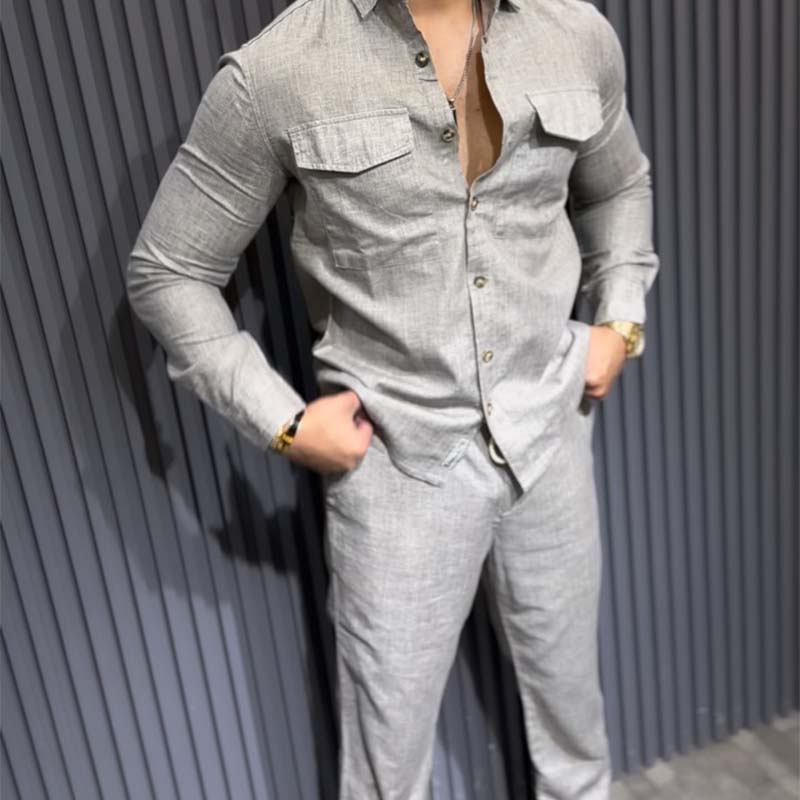 MÅNGSIDIG KOMBINATION – Denna skjorta och byxor är designade för enkel koordinering och ger ett sammanhängande, välkomponerat utseende. Neutrala toner och en strukturerad skärning gör det enkelt att matcha med accessoarer eller skor. Setet är perfekt för hemmet, kontoret eller avslappnade utflykter och balanserar komfort med raffinerad stil, vilket ger en strukturerad men ändå avslappnad ensemble.